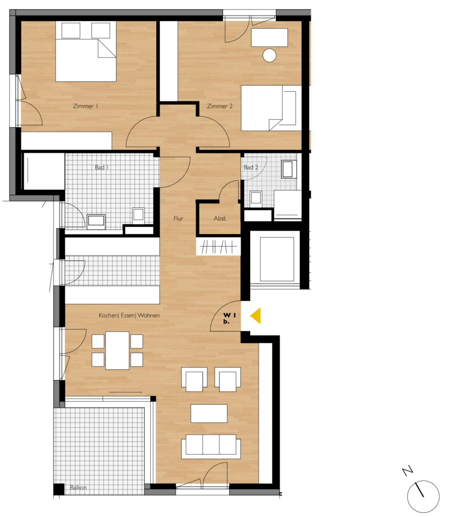 Das Haus verfügt über moderne 2- bis 3-Zimmer-Wohnungen. Jede Wohnung verfügt über eine effiziente Raumplanung, große Fensterflächen und hochwertige Außenbereiche wie Balkon oder Terrasse mit Privatgarten.